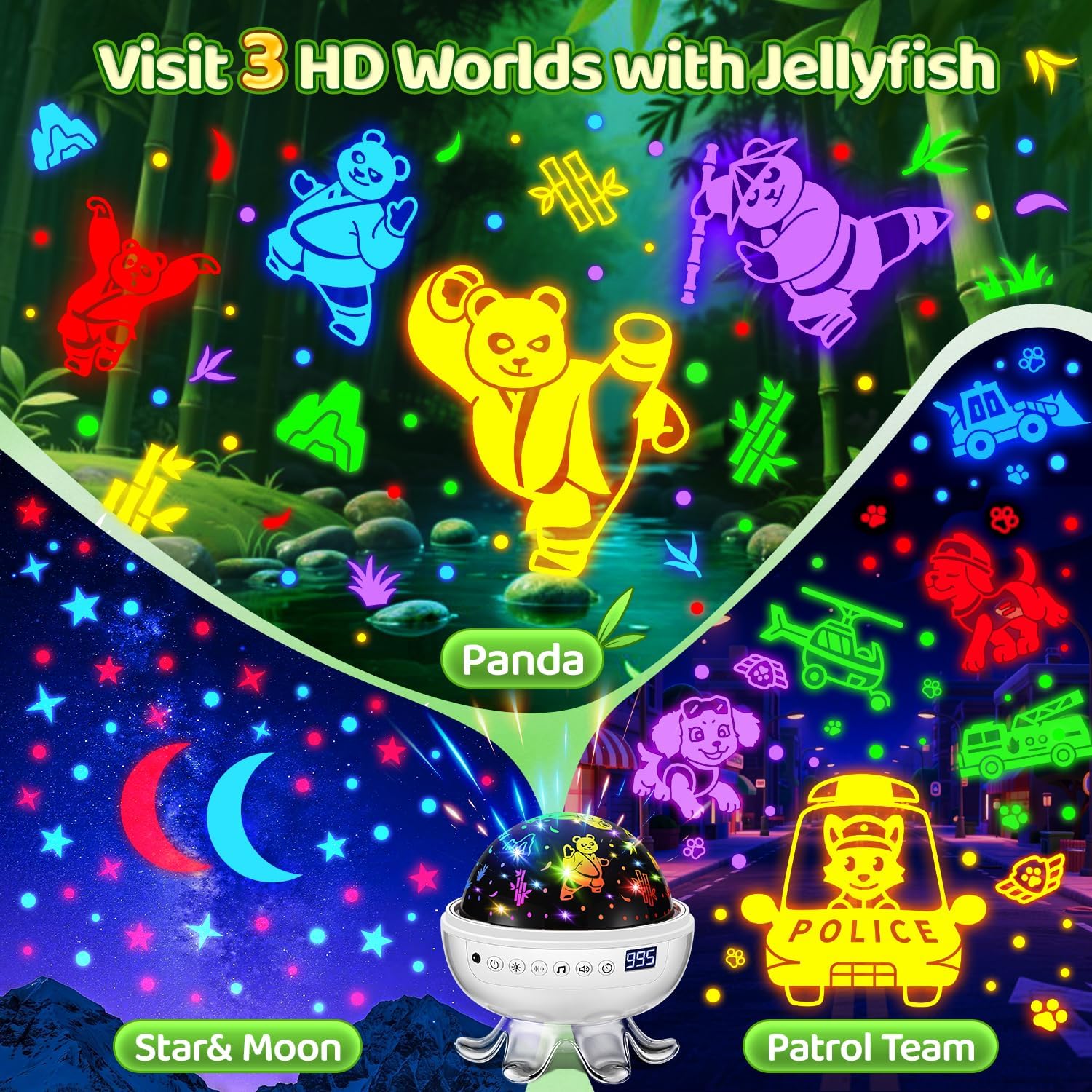 - 【3 HD Films Switch in 3 Seconds】This panda gifts, panda toys comes with 3 HD films—Panda& Patrol Team& Starry Moon. 3 films of kids night light projector night light are high-end, producing clear and vivid projections. With 3 themes included, kids can freely journey through a richly varied fantasy world--afterall,switch slides only takes 3 seconds. Giving the portable sound machine baby to kids is like gifting them a glowing dream: play kung fu with light heroes; embark on adventures with squad, or roam the cosmos~ Join thousands of satisfied customers with this 4 year old boy toys for 2 year old boy toys for 6 year old boys, kids toys boys 3-5, 7 year old boy gifts for 2 year old boy!