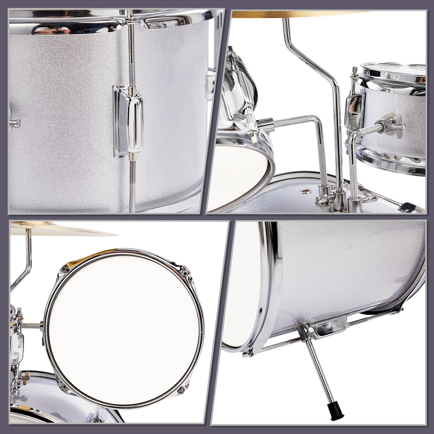 Ktaxon 5-Piece Complete Junior Drums Set, 14 Inch Beginners Drum Kit with Throne Stool, Pedal & Drumsticks, Kids Drums Musical Instruments W/Cymbal, Hi-Hat, Floor, Tom and Snare Drum (Silver)