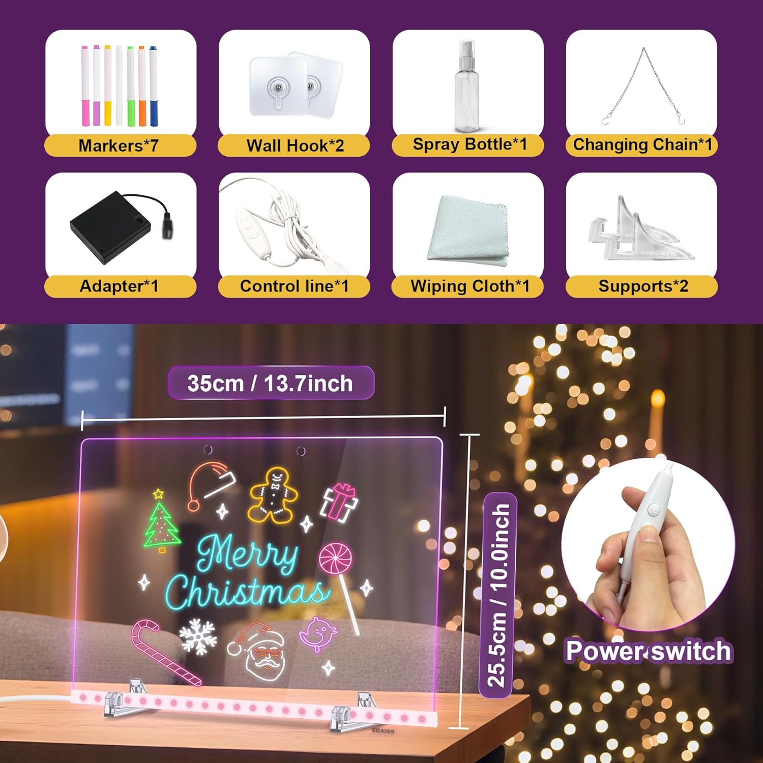 - 【Premium Set】This reusable LED drawing board features an acrylic surface with a clear, spacious display. It serves as a versatile tool—functioning as a traditional message board, art supply, doodle pad, and light-up display—perfect for jotting down menus, reminders, to-do lists, and weekly highlights. The set includes an LED acrylic message board, folding stand, battery box (without battery), and 7 colored pens.