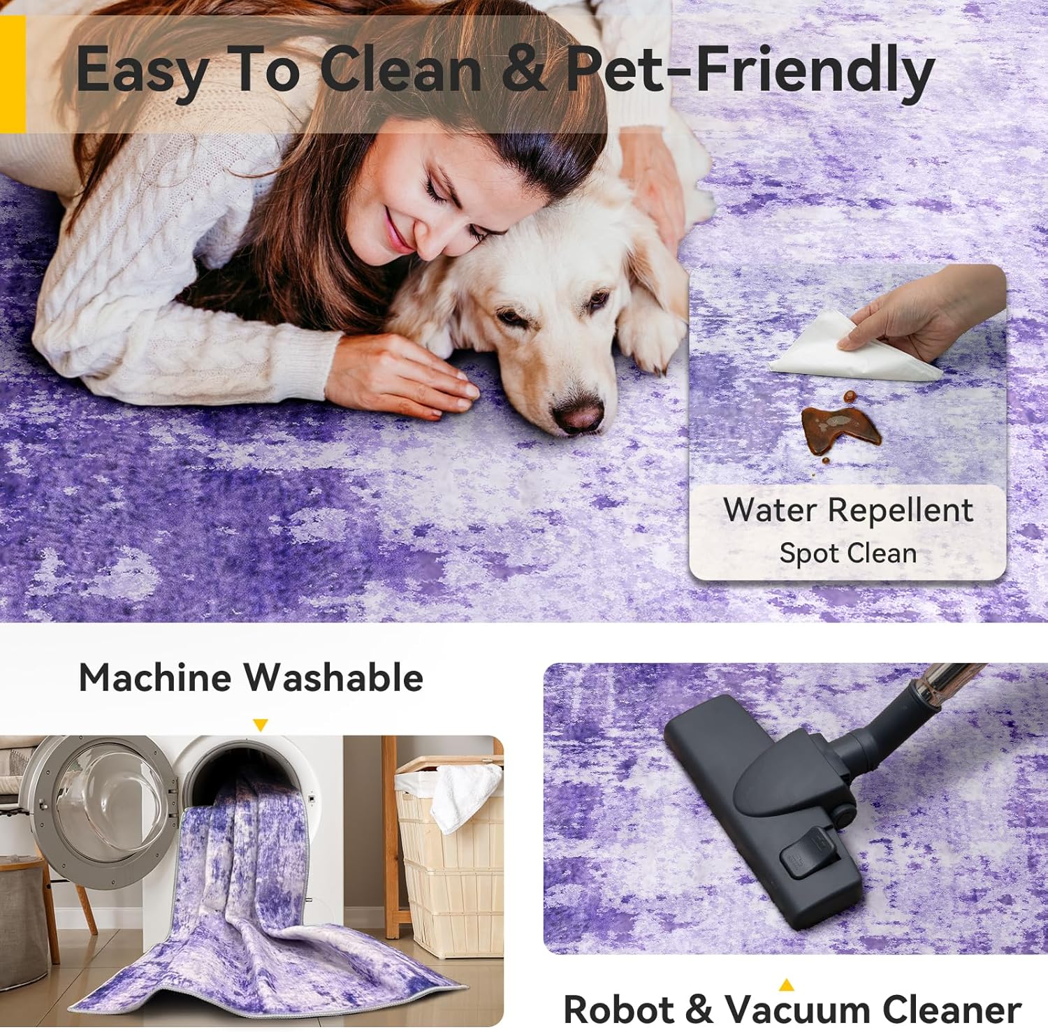 - Tides Series β Effortless style that flows with your life.This modern machine-washable non-slip rug features reinforced edges and a low-pile design that resists dirt. Its water-repellent surface makes spills easy to clean - liquids bead up for quick wiping. Simply machine wash in cold water (no bleach) to refresh. The non-slip backing keeps it securely in place. A perfect blend of function and contemporary design for active homes.