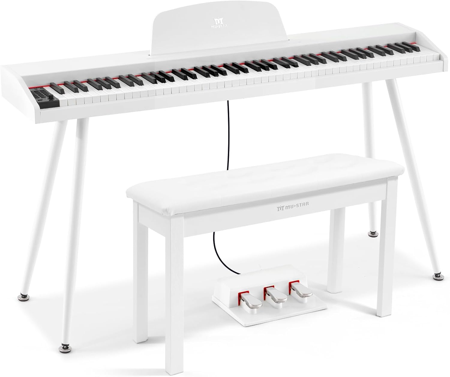 MUSTAR 88 Key Piano Keyboard with Piano Bench, Digital Piano 88 Semi Weighted Keys, Portable Electric Piano with Storage Stool, 3 Pedals, Built-In Speakers, USB/MIDI, White