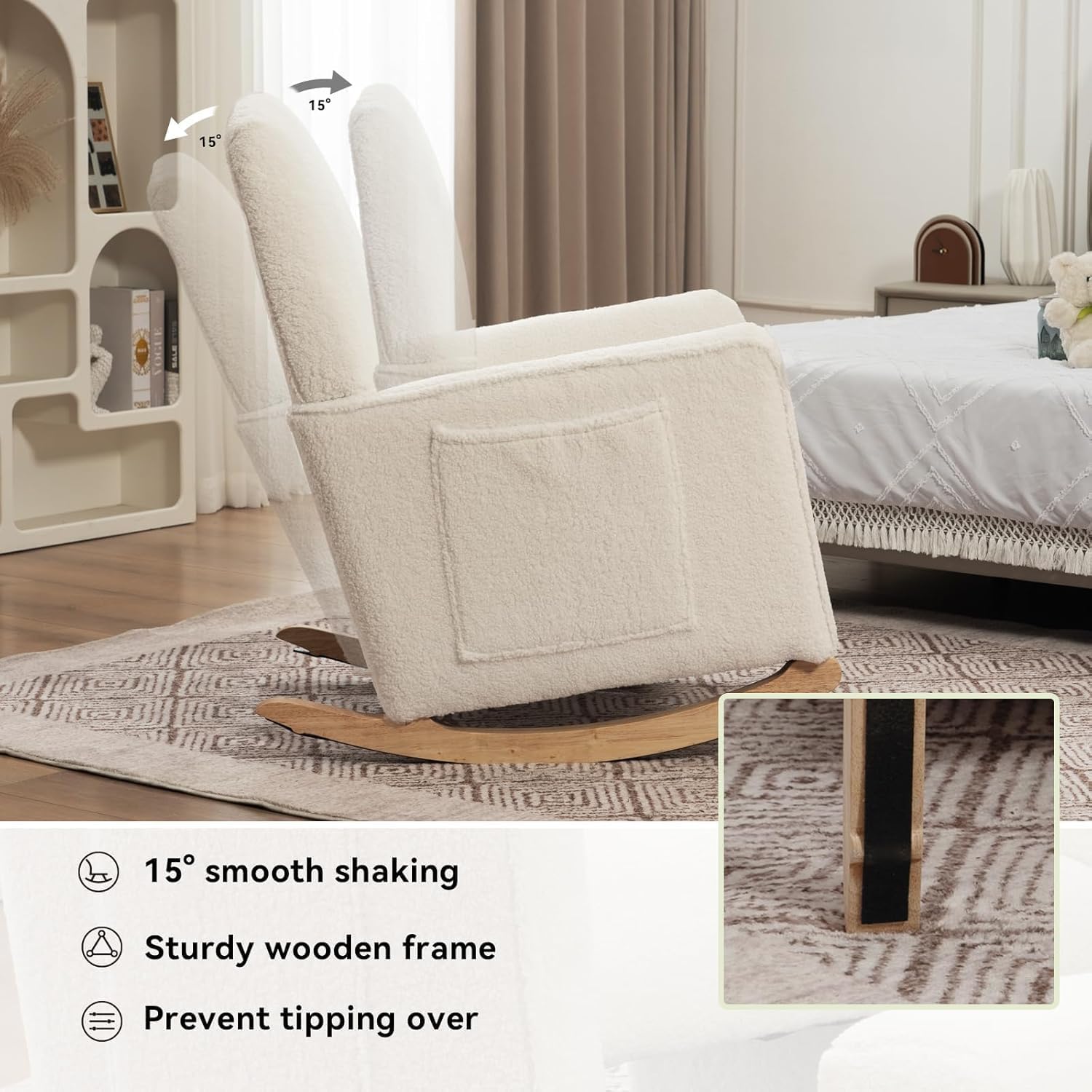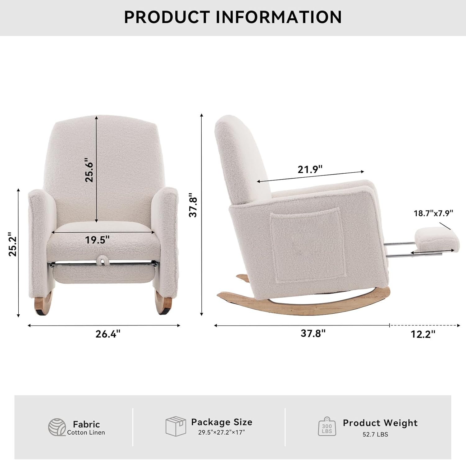 FOXHUNTER Rocking Chair Nursery with Adjustable Footrest and High Backrest, Upholstered Glider Chairs with Side Pockets for Nursery, Rocker Armchair Indoor for Living Room,White