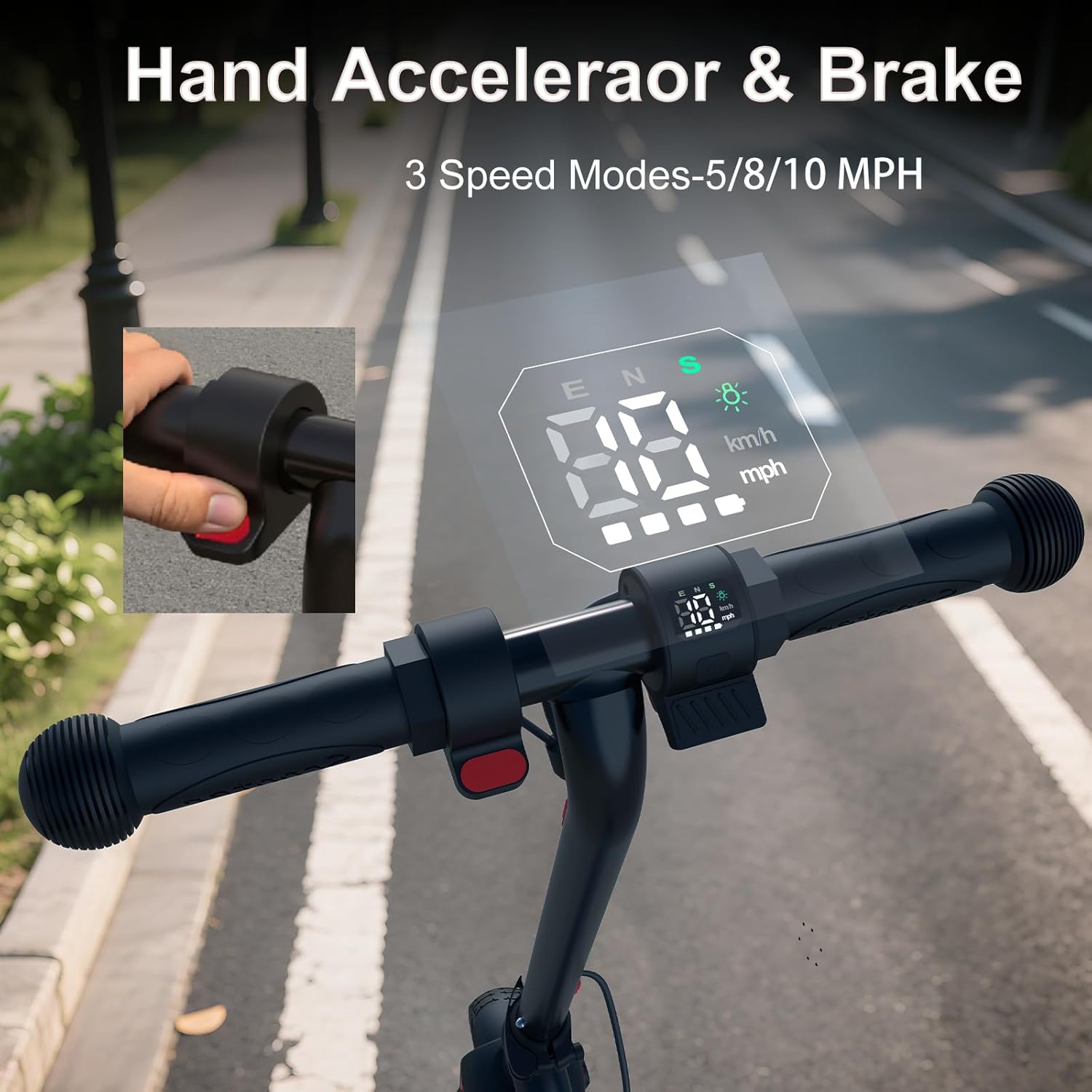 - β¨ Hand Accelerator & Brake: Caroma E6 electric scooter for kids features hand-operated acceleration and braking for safe, easy riding. Simply kick-start to 3 mph, then press and hold the throttle for smooth acceleration. The reliable dual-brake system ensures confident stopping power in any riding condition.