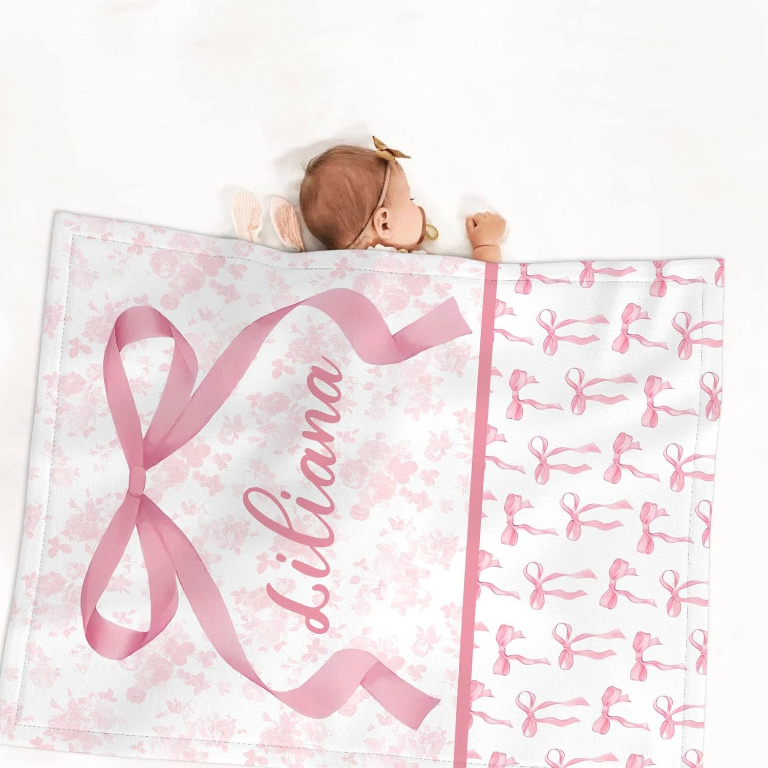 Personalized Baby Girl Crib Bedding Set – Custom Name Pink Bow 3-Piece Nursery Set with Soft Flannel Blanket, Fitted Sheet & Pillowcase – Infant & Toddler Bedding Gift