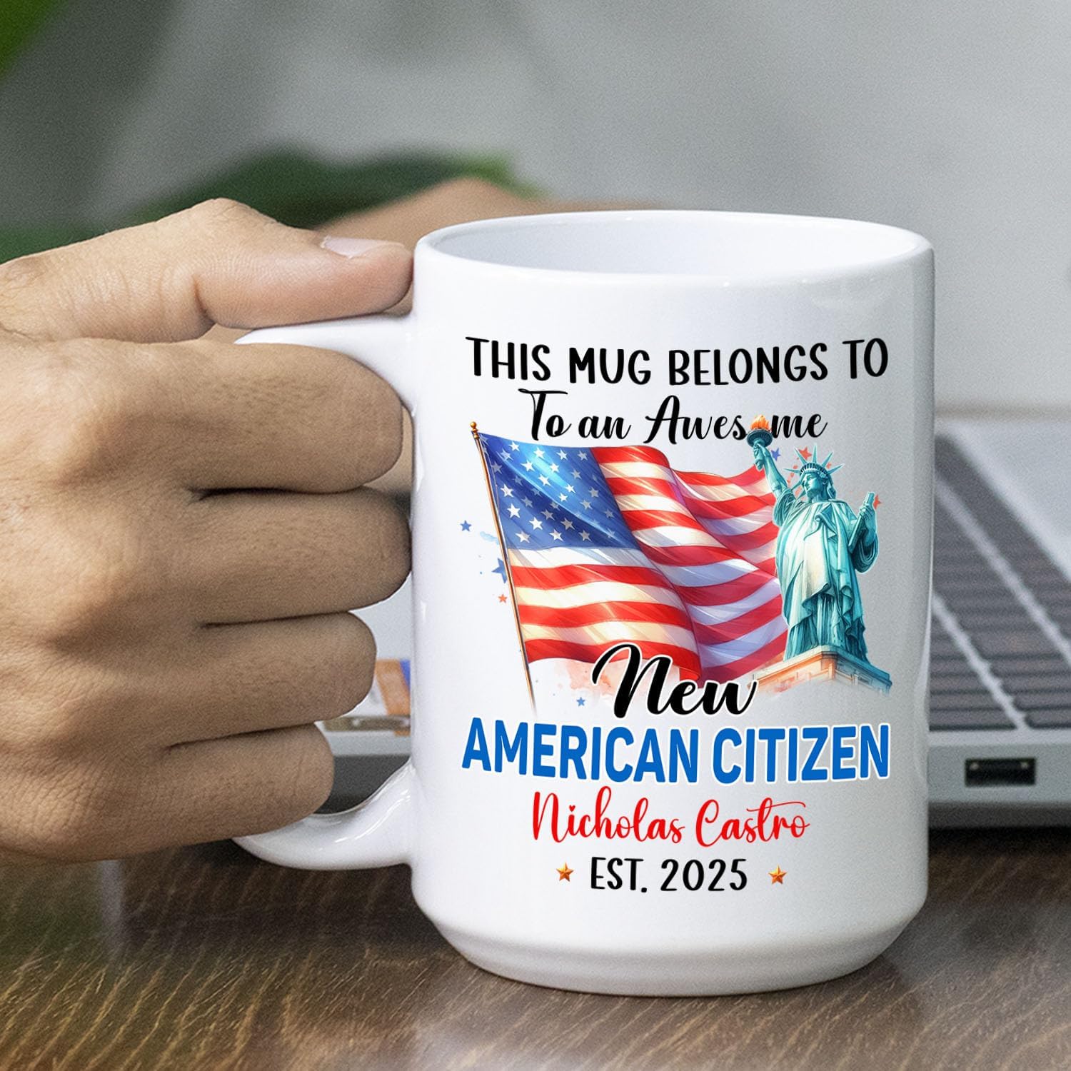 Personalized USA Flag White Mug Gift For New US Citizen on Citizenship Celebration, This Mug Belongs To An Awesome New American Citizen Cup, Customized Year & Name US Citizenship Coffee Cup 11 15Oz