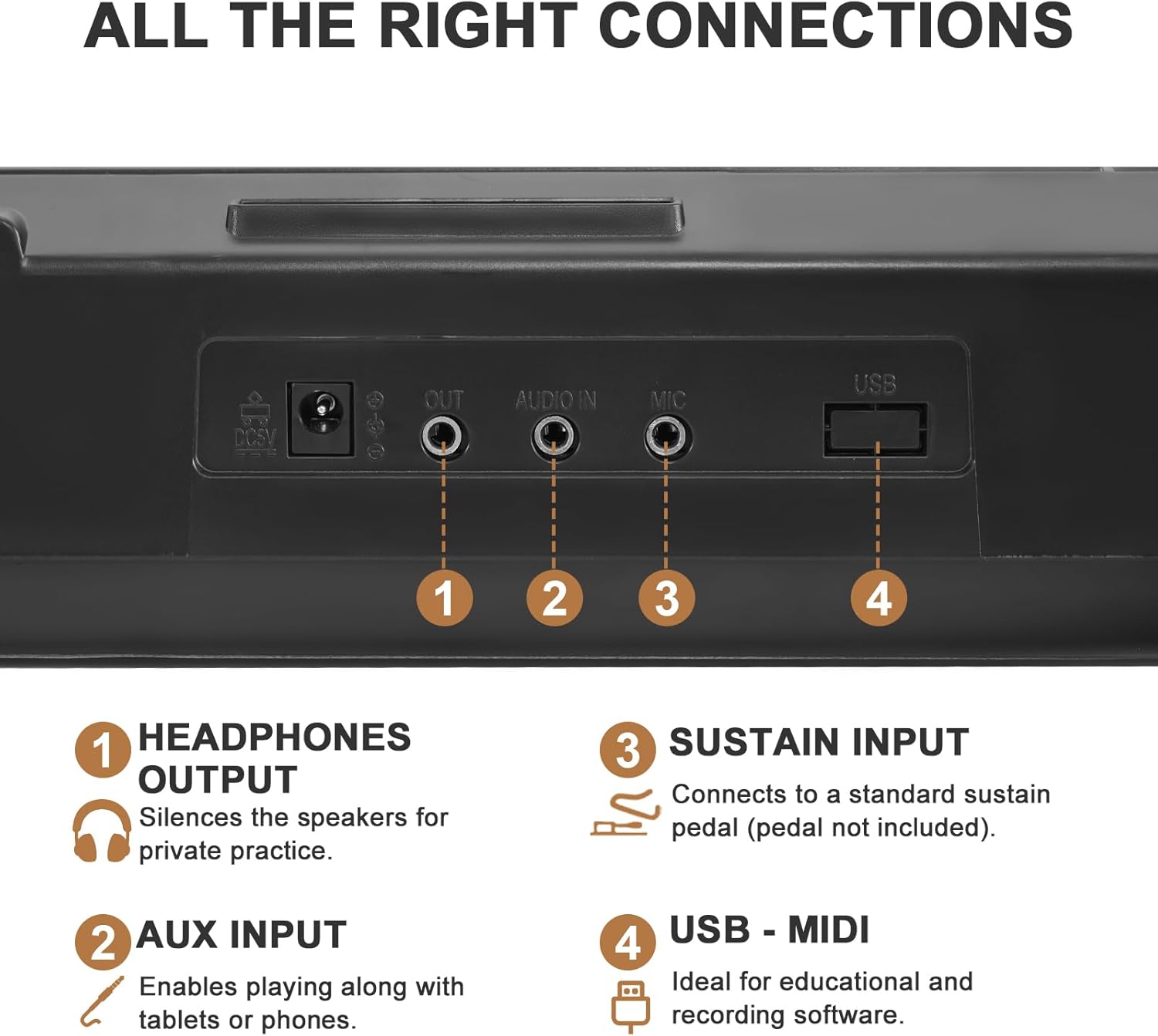 - Ultra-Portable & Flexible Power: Lightweight ABS body (<2.1kg) with battery operation (4ΓAA, not included) or adapter support enables music creation anywhere β ideal for travel, classrooms, or impromptu performances