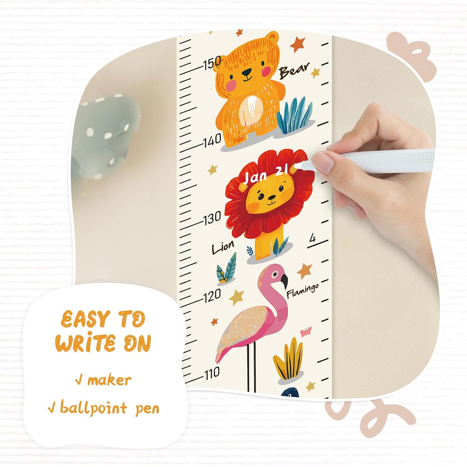 - Design: Kids growth chart with rope at the top of the chart, easy to install and removeable, foldable and portable design, easy to store, hang, roll up, transport, and save space. It boasts a material that's easy to write on, where you can use dark colored ballpoint pens and markers to track growth milestones.
