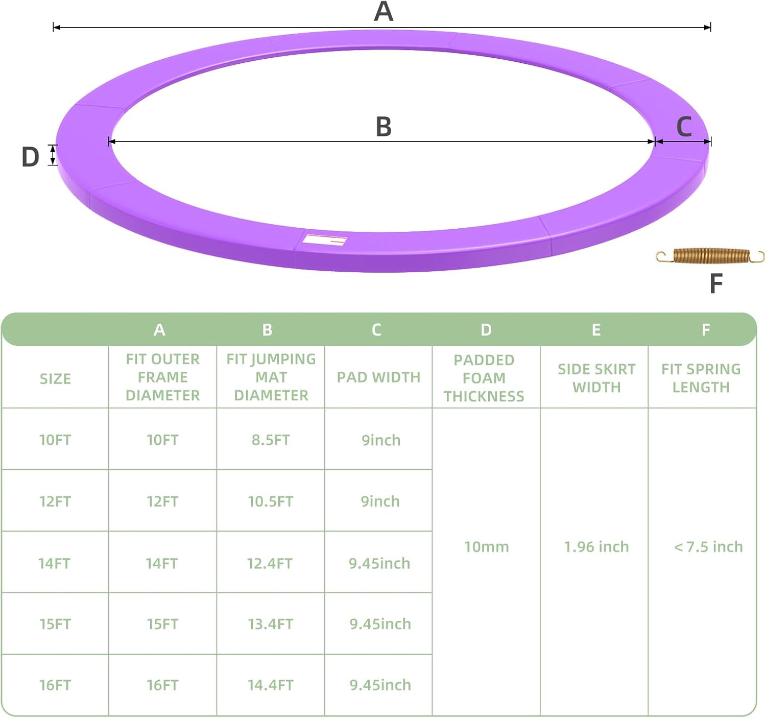 - 【Rich Configuration】Our trampoline mats come in four colors: blue, black, purple, and gray, and five sizes: 10ft, 12ft, 14ft, 15ft, and 16ft, to meet the needs of most trampolines.