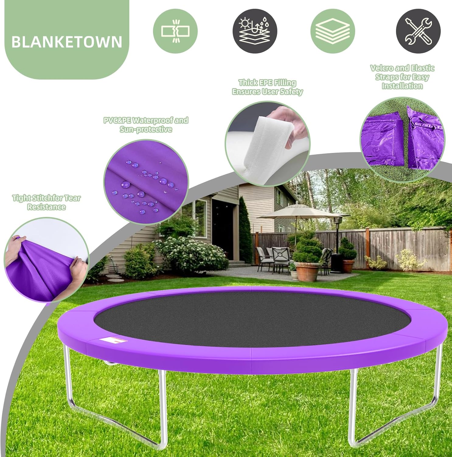 - 【Rich Configuration】Our trampoline mats come in four colors: blue, black, purple, and gray, and five sizes: 10ft, 12ft, 14ft, 15ft, and 16ft, to meet the needs of most trampolines.