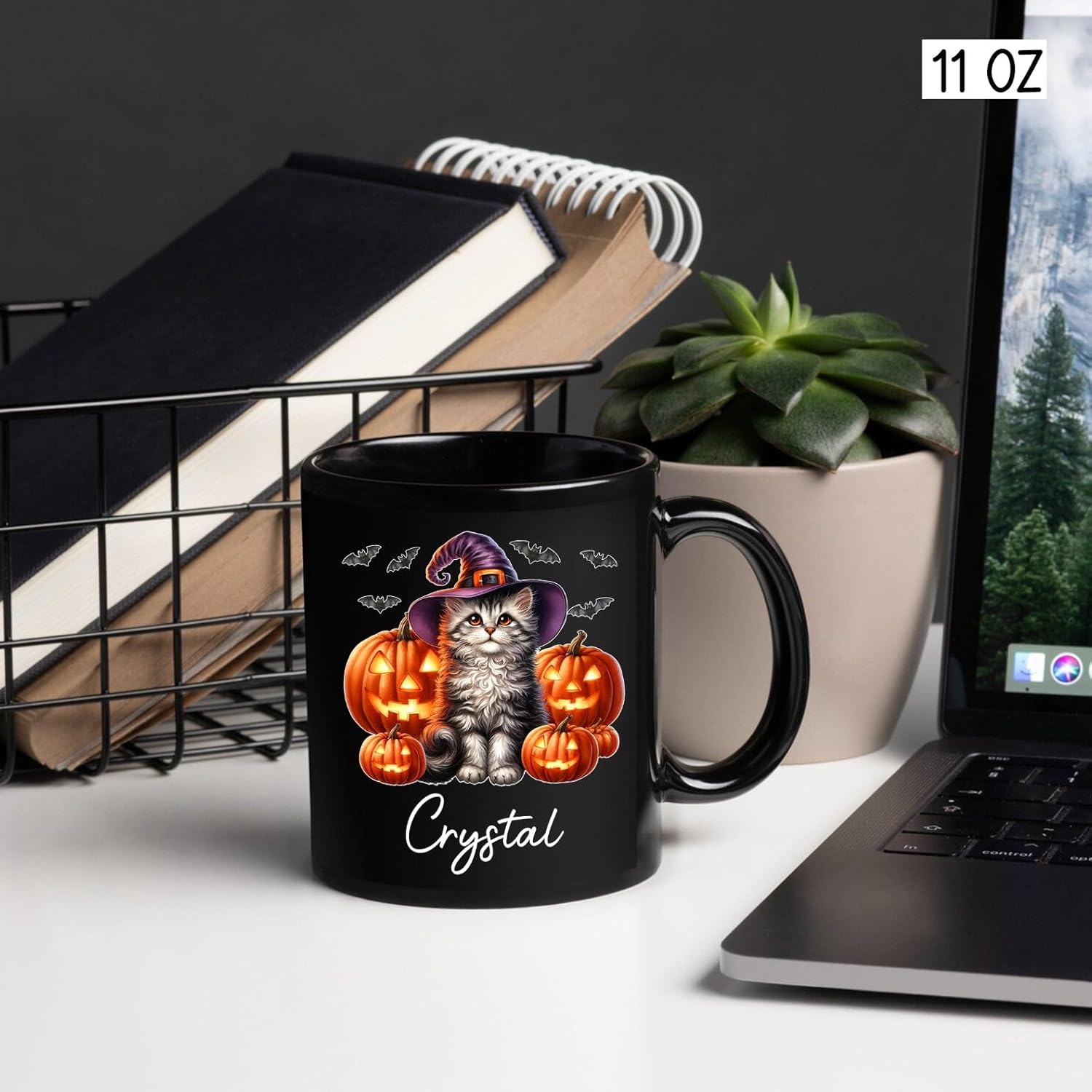 Personalized Halloween American Curl Ceramic Mug 11oz 15oz, Custom Name American Curl Wearing Witch Hat Coffee Cup, Cat with Pumpkins Halloween Black Cup, Spooky Cat Mug Gift for Pet Lover