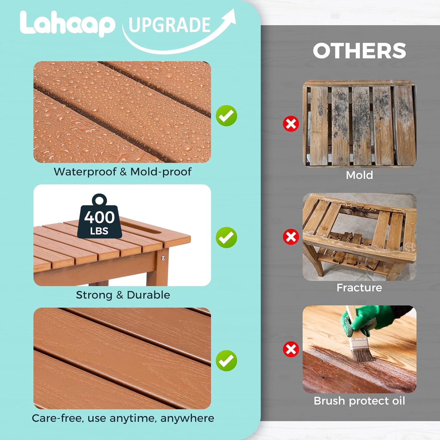 - ă100% Waterproofă The shower bench is made of HIPS (poly lumber), with 304 stainless screws, which is highly water proof, never rot and moldy. Easy to clean, just wipe it with a towel.