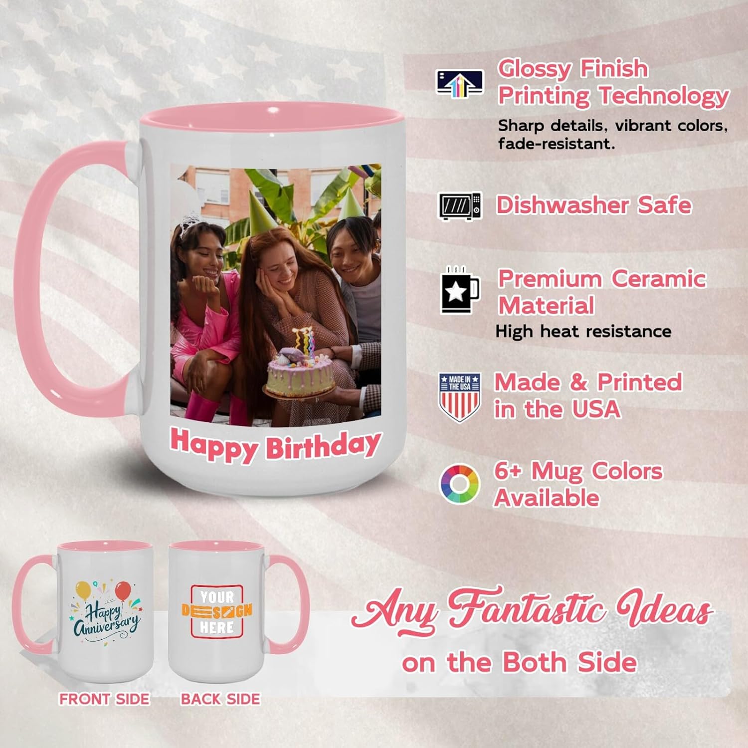 - Proudly Made In The USA: Simply upload your photo or add text to design your own mug. Our personalized cup are printed with vivid, fade-resistant colors to keep your memories fresh sip after sip.